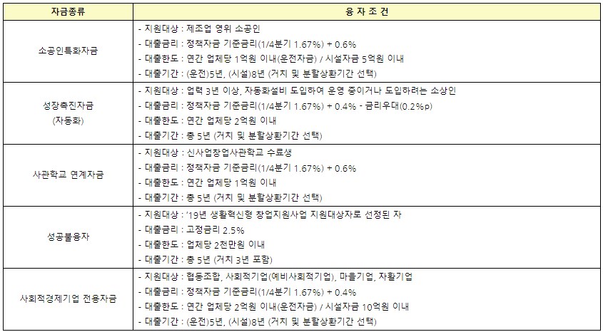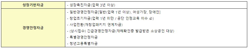 소공인특화자금, 성장촉진자금(자동화), 신사업창업사관학교 연계자금, 생활혁신형창업지원 연계자금(성공불융자), 사회적경제기업 전용자금