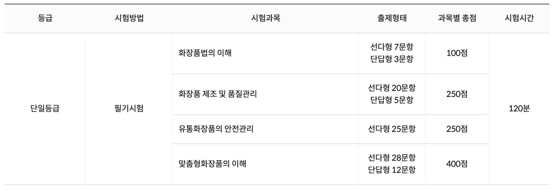 맞춤형화장품조제관리사 자격시험에는 응시 자격 제한이 없으며, 다음과 같은 과목에서의 이해와 지식을 평가합니다:
