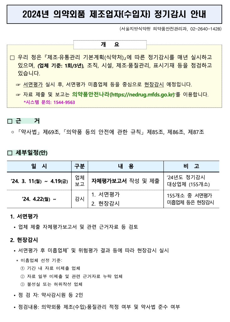 2024년도에는 의약외품 제조업체 및 수입업체를 대상으로 하는 정기감시가 계획되어 있습니다. 이는 각 지방 식약청에서 연간 계획에 따라 실시되며, 경인 식약청을 비롯한 여러 지방 식약청에서는 정기감시 대상 업체에게 이미 안내 공문을 발송한 상태입니다.