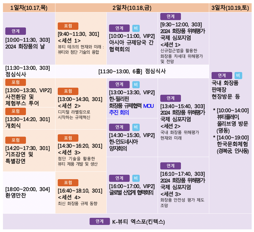 2024년 10월 17일부터 19일까지 일산 킨텍스에서 개최되는 ‘2024 원아시아 화장품 뷰티 포럼’은 급변하는 글로벌 화장품 규제 환경에 발맞춰 다양한 신기술과 규제 체계를 논의하기 위한 국제적인 행사입니다. 이번 포럼은 식품의약품안전처(식약처) 주관으로 아시아 각국의 규제당국과 화장품 산업계, 학계 전문가들이 한자리에 모여 화장품 분야에서의 혁신 기술 및 규제 협력을 강화하는 중요한 자리로 마련되었습니다.