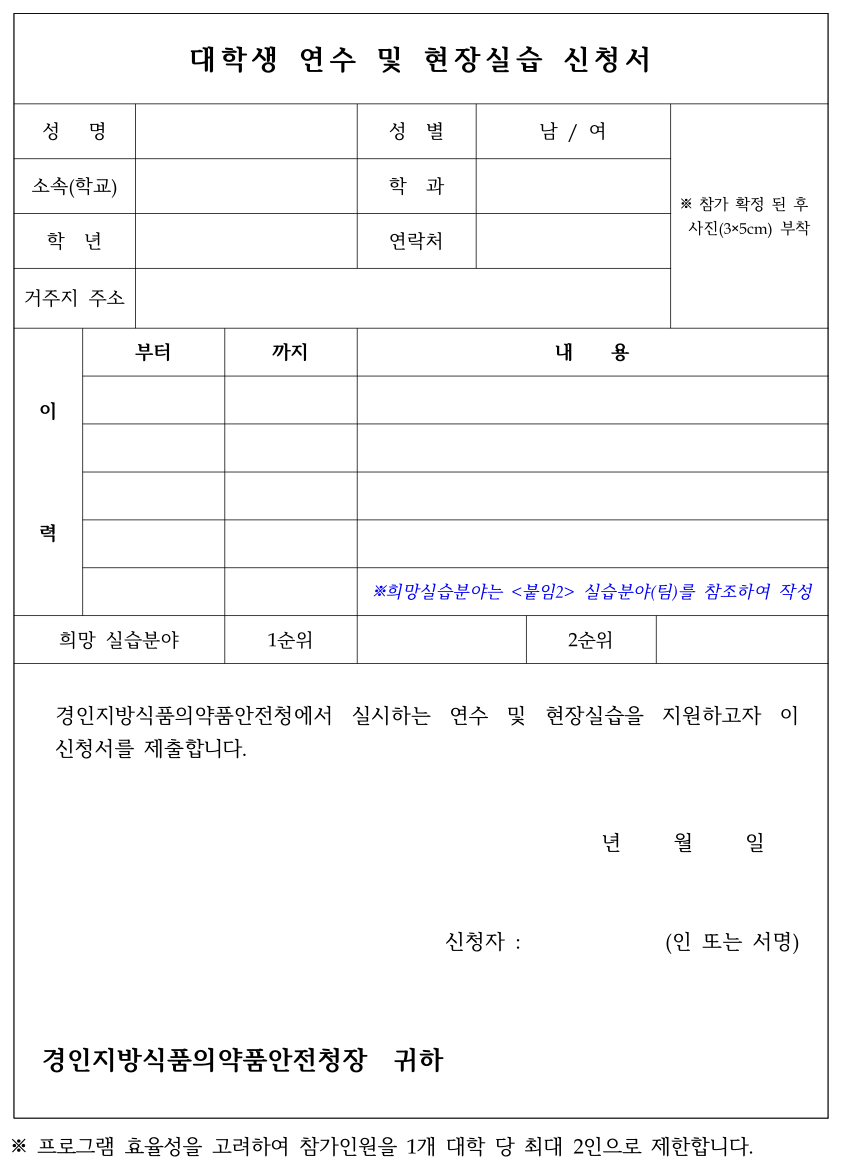 참가를 희망하는 학생은 소속 대학교(학과)를 통해 신청서를 제출해야 합니다. 신청서 양식은 경인지방식품의약품안전청에서 제공하는 ‘대학생 연수 및 현장실습 신청서’를 사용하며, 각 대학교는 공문 또는 이메일(smart1@korea.kr)을 통해 제출할 수 있습니다. 문의는 시험분석센터 유해물질분석과 김재현 주무관(032-450-3239)에게 연락하면 됩니다.