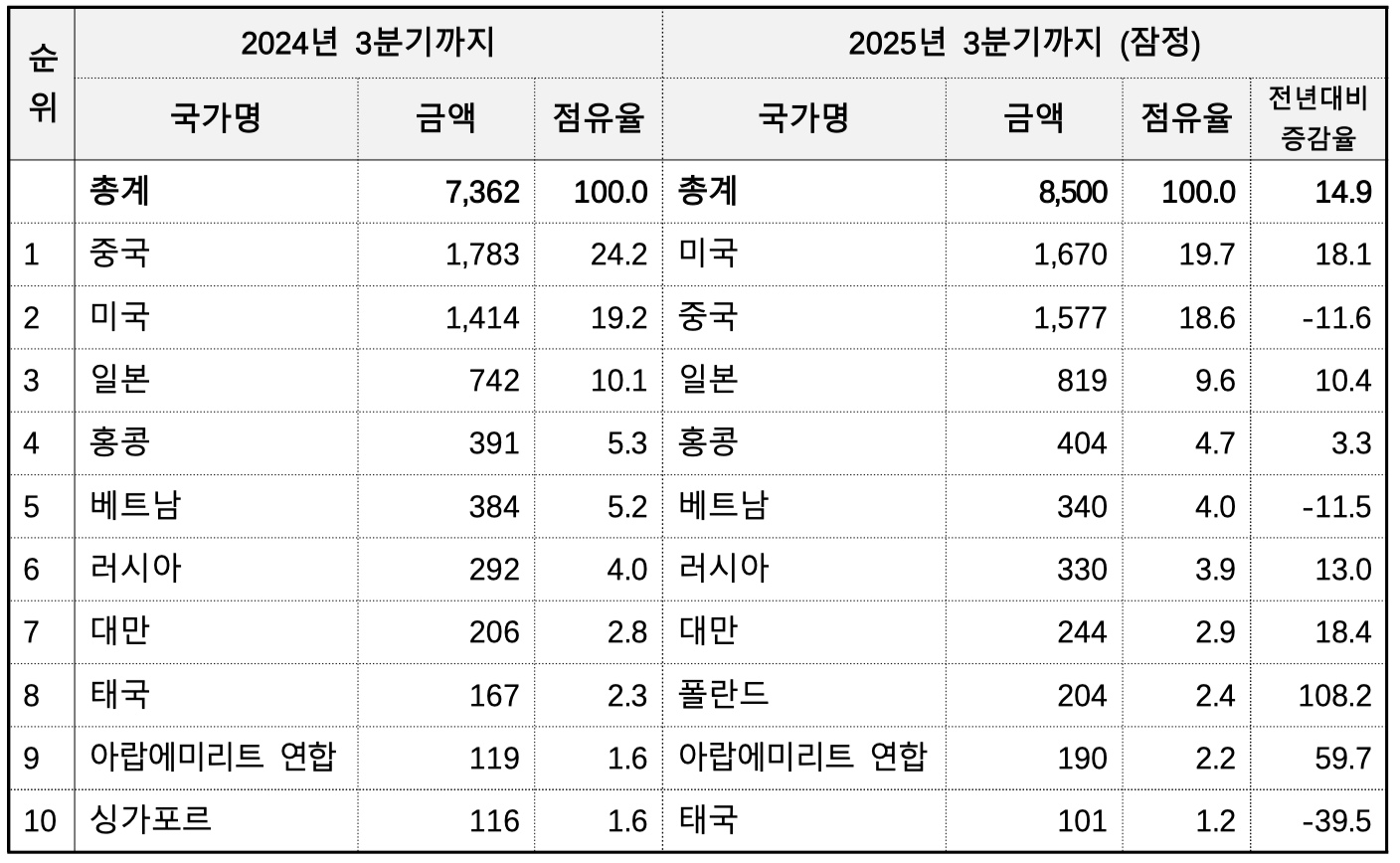흥미로운 변화는 국가별 순위입니다. 미국이 처음으로 수출 1위에 올라섰습니다. 3분기까지 미국 수출액은 16.7억 달러로 전체의 19.6%를 차지하며, 전년 대비 18.1% 증가했습니다. 이는 최근 5년간 2배 이상의 성장률을 보인 결과로, K-콘텐츠 열풍이 화장품 수요를 폭발시켰습니다. 드라마와 SNS를 통해 퍼진 K-뷰티 트렌드가 미국 소비자들의 지갑을 열게 한 셈입니다.