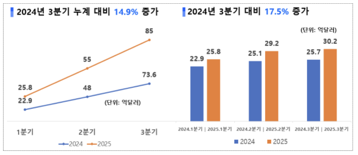 2025년 3분기 누계 수출액은 전년 동기 대비 14.9% 증가한 85억 달러를 기록했습니다. 이는 2023년 연간 수출액을 이미 초과한 수준으로, K-뷰티 산업의 탄탄한 기반을 증명합니다. 특히 3분기 단독 수출액은 30.2억 달러로, 전년 대비 17.5% 급증하며 분기별 최고치를 세웠습니다. 이러한 성과는 매월 최고 실적을 갈아치우는 패턴에서 비롯됩니다. 1월부터 9월까지 대부분의 달이 역대 최고를 경신했으며, 9월에는 11.7억 달러를 달성해 28.5%의 성장률을 보였습니다.
