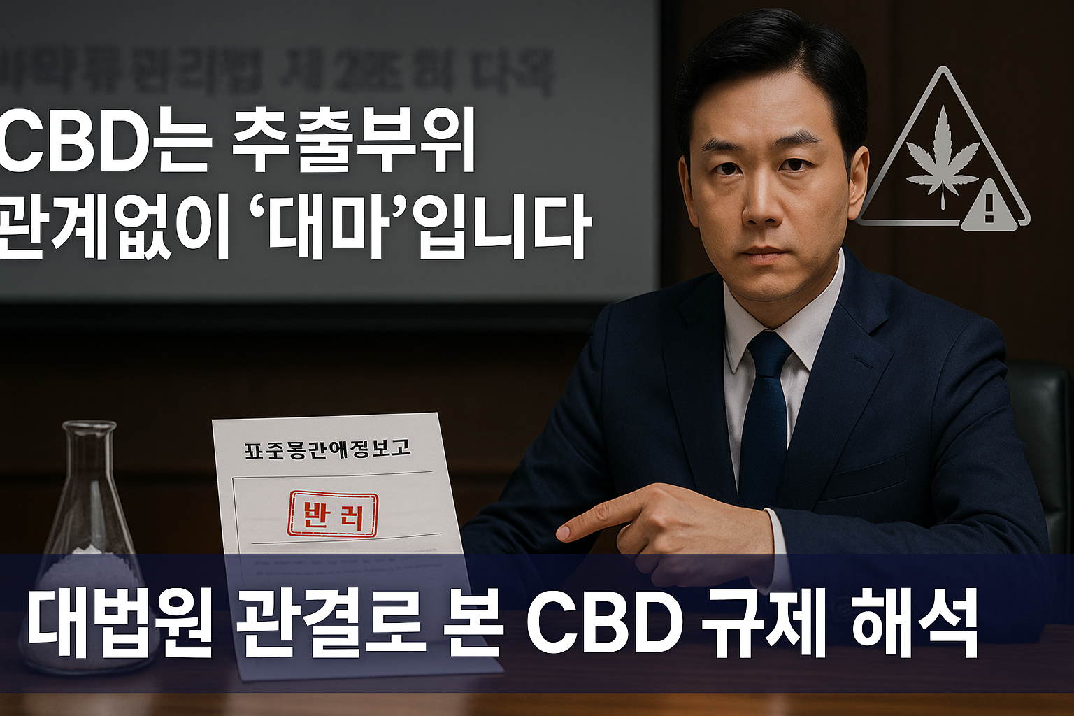 CBD 관련 제품의 수입, 유통, 사용에 앞서 반드시 마약류관리법, 식약처 고시, 대법원 판례를 종합적으로 확인해야 합니다. 최근 판례는 산업적 활용 외 대부분의 사용을 사실상 금지 또는 엄격히 제한하고 있음을 분명히 합니다.
