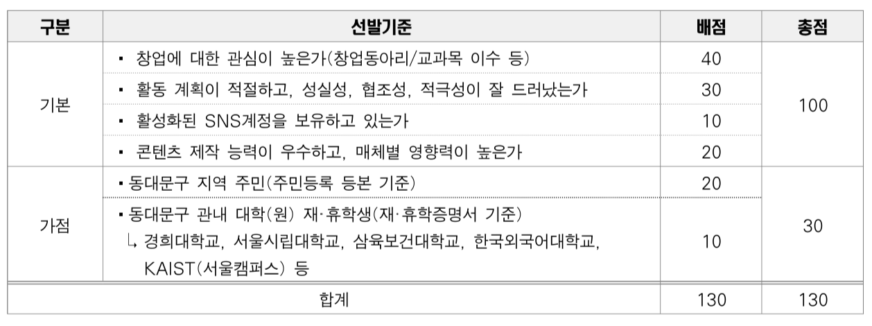 - 동대문구 관내 대학(원) 재·휴학생: 10점