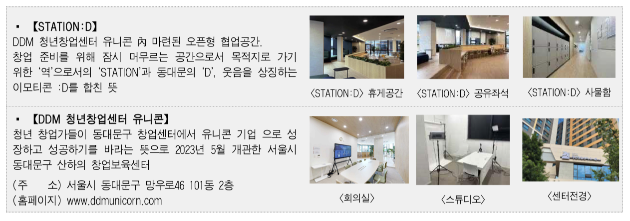 DDM 청년창업센터 유니콘은 2023년 설립 이후, 창업가들에게 동대문구에서 창업 활동을 펼칠 수 있는 환경을 제공해왔습니다. 특히 공유공간인 STATION:D는 청년들에게 협업과 창작을 돕는 창업 보육의 거점 역할을 합니다.