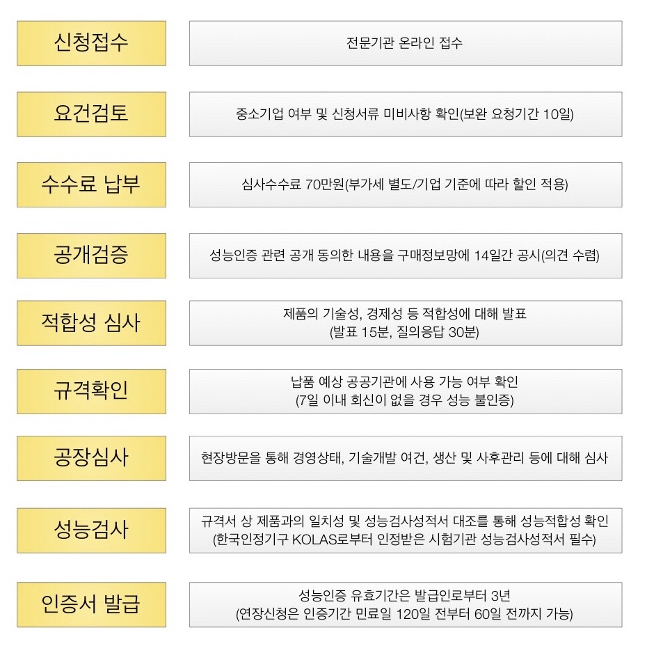 선능인증 시험항목의 기준치는 최소한 KS규격 동등 이상이어야 하며, 성능인증 취득을 통해 ‘기술개발제품 우선구매제도’ 지원 대상이 될 수 있으며, 공공기관 등과 수의계약을 체결할 수 있는 요건을 갖추게 됩니다.