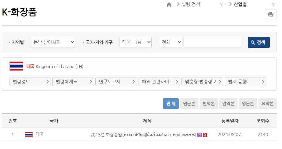 태국 시장에 진출하려는 국내 화장품 업체는 세계법제정보센터를 통해 태국 화장품법 원문 및 번역본을 확보하여 원활한 시장 진출을 할 수 있었습니다. 해외 규제 정보가 부족한 기업들에게 필수적인 자료를 제공하며, 맞춤형 법률 정보를 지원하고 있습니다. - 콘텐츠 산업 지원 사례
